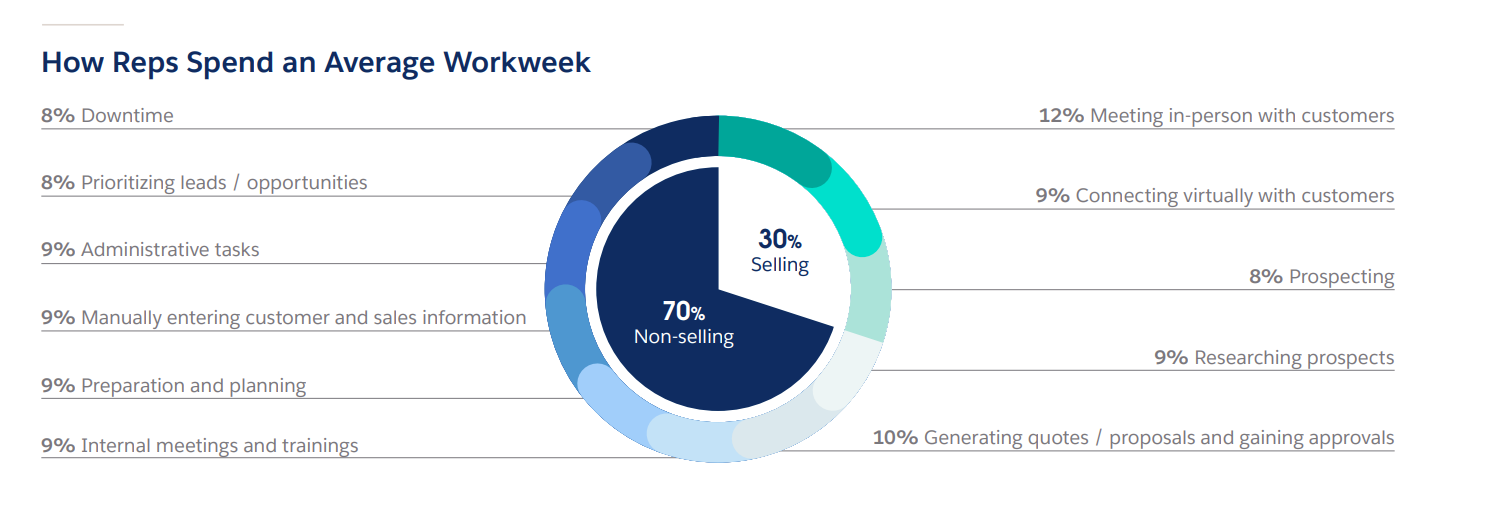 In the Salesforce State of Sales report, respondents stated they spent 70% of their time on non-selling activities. These tasks include admin, preparation, and manual data entry.