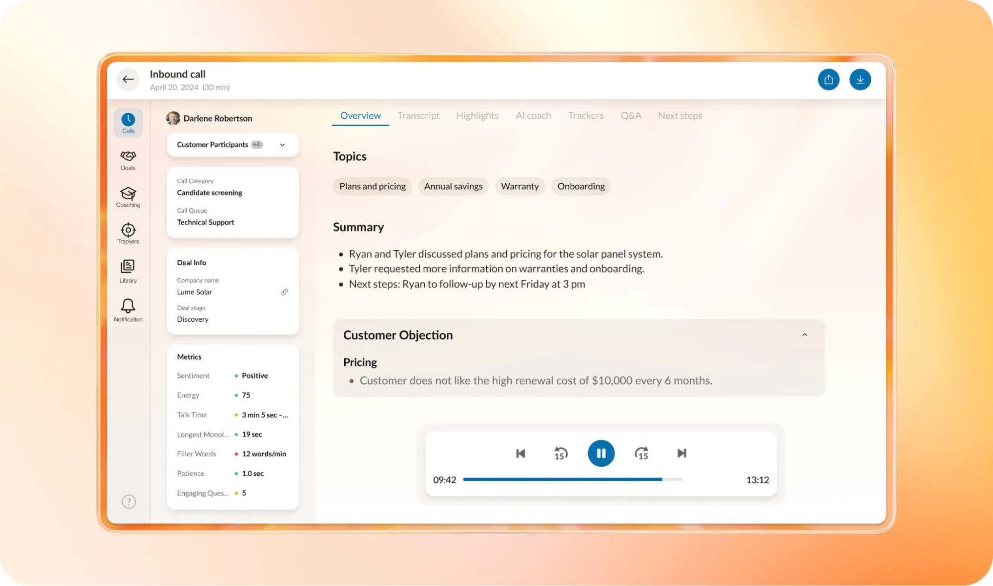 Our conversation intelligence solution helps you and your team work smarter. Let our AI take over manual admin tasks and post-call work so you can focus on nurturing leads and winning deals.