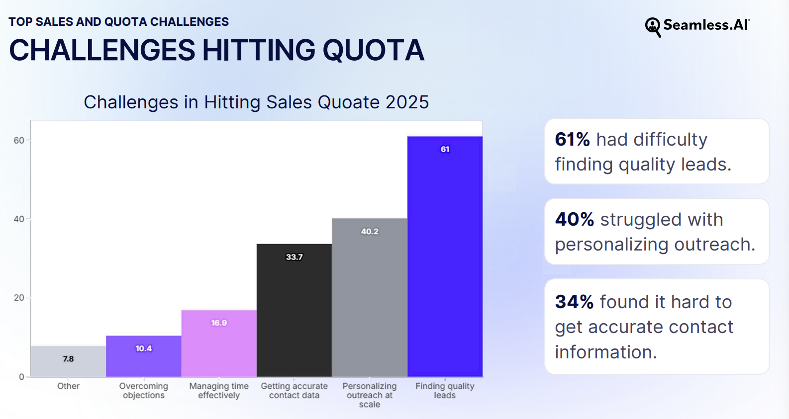 In a recent report from Seamless.AI, 61% of respondents stated that the biggest challenge to meeting sales targets was difficulty in finding leads. Guess what? AI tools help your team find better prospects for outreach and generate higher-quality leads.