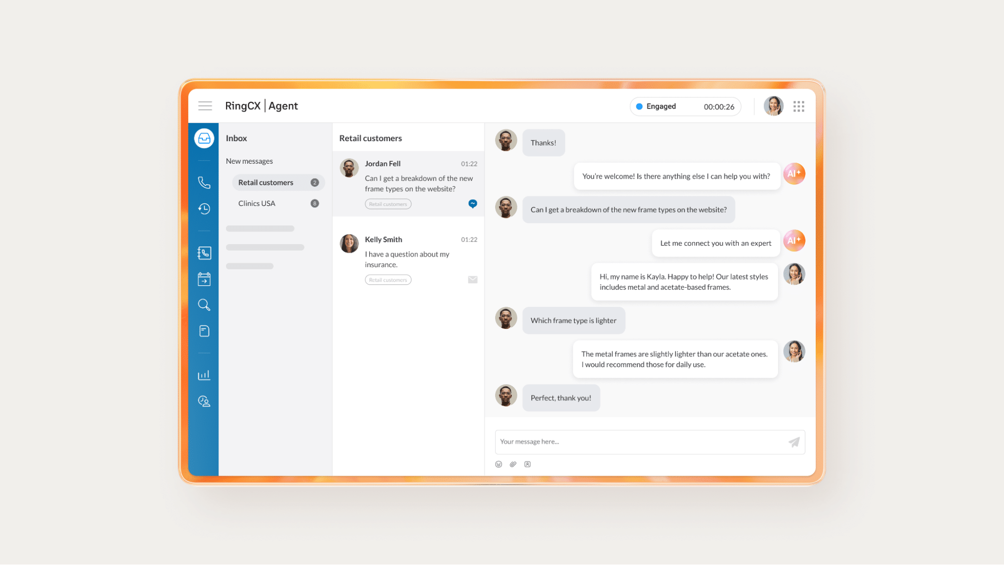 RingCX supports your agents as well as your customers, with AI tools helping them to respond quickly and develop a deep understanding of customer needs. Automate repetitive tasks to streamline your contact center operations, and use the analytics and reporting features to monitor performance and make improvements.
