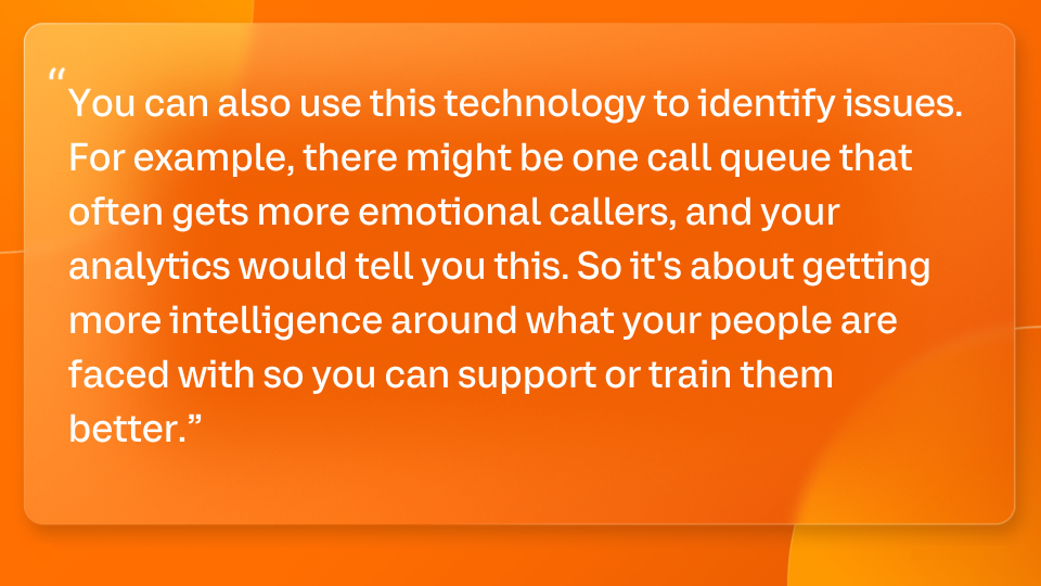 Speech analytics, particularly sentiment analysis, can spot which customers are emotional and provide insight – even in real time – triggering an alert to a Team Leader to check in on the agent after a call.
