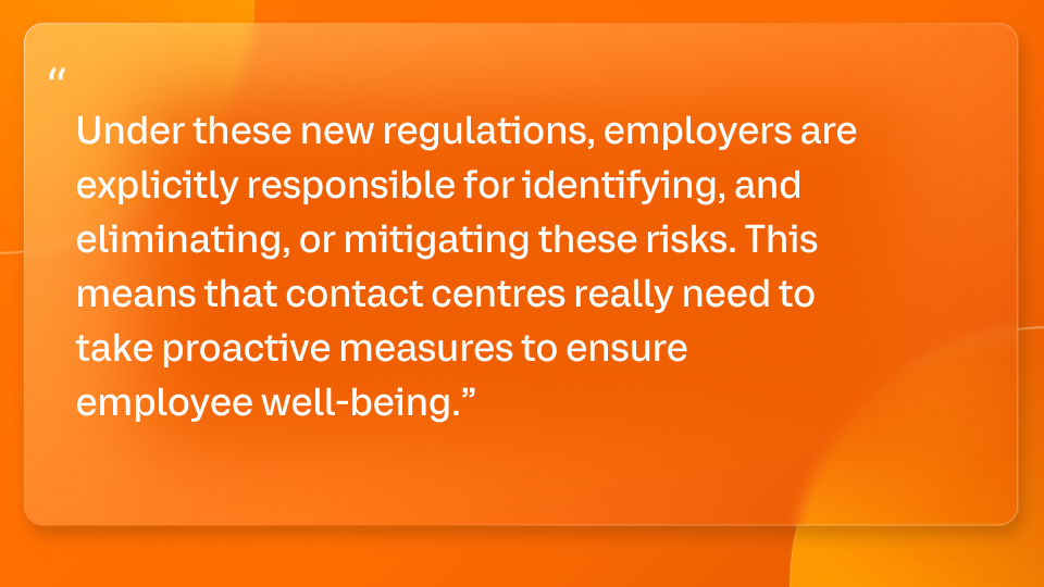 The WHS regulations now demand more detailed considerations of psychosocial hazards, with red flags to those business units with high turnover and absenteeism – such as contact centres.