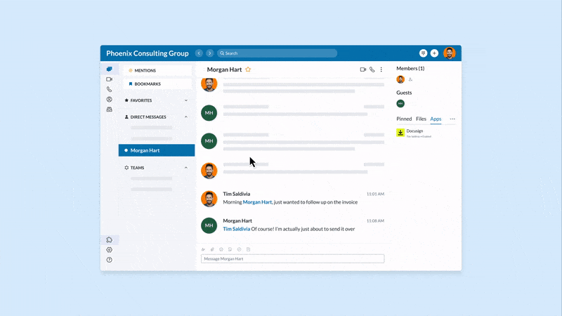 Workflows are natively integrated into team messaging, so you can perform actions without ever having to switch apps. For example, we’re working on a DocuSign add-in that allows you to review and sign documents directly in RingCentral.