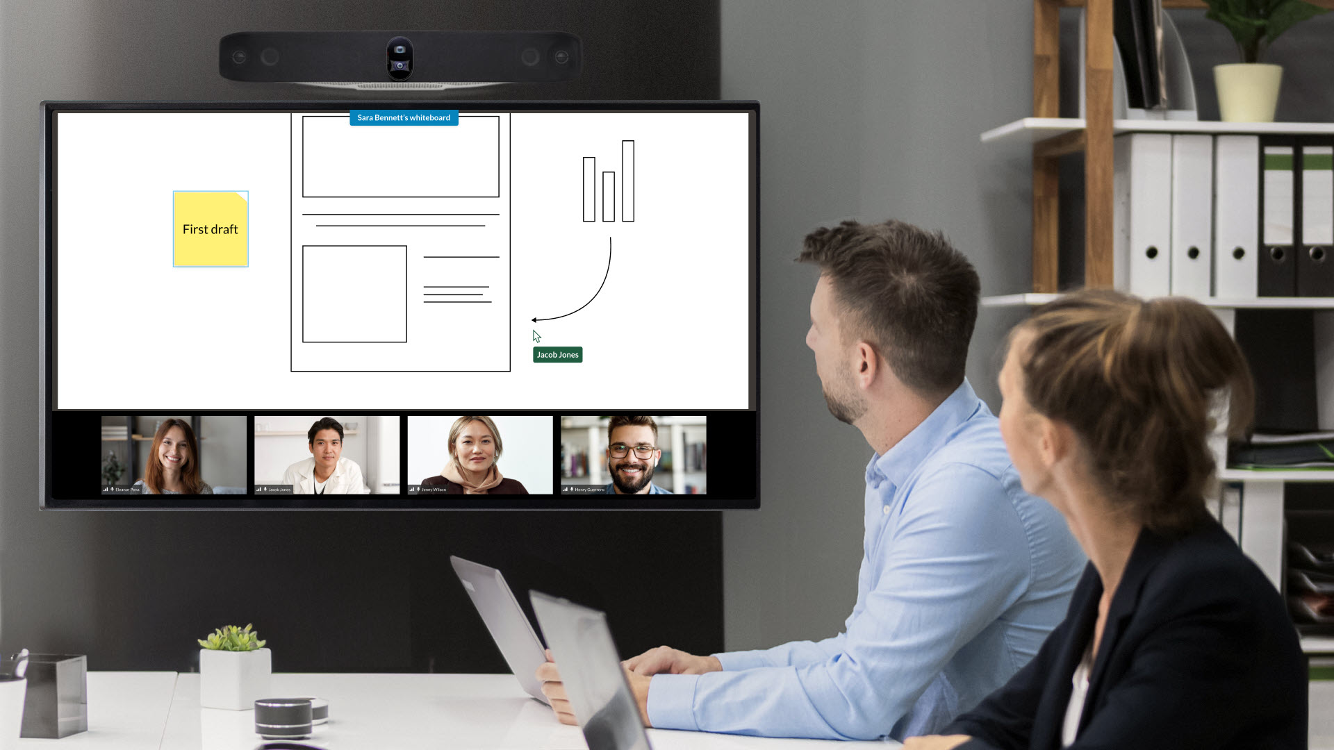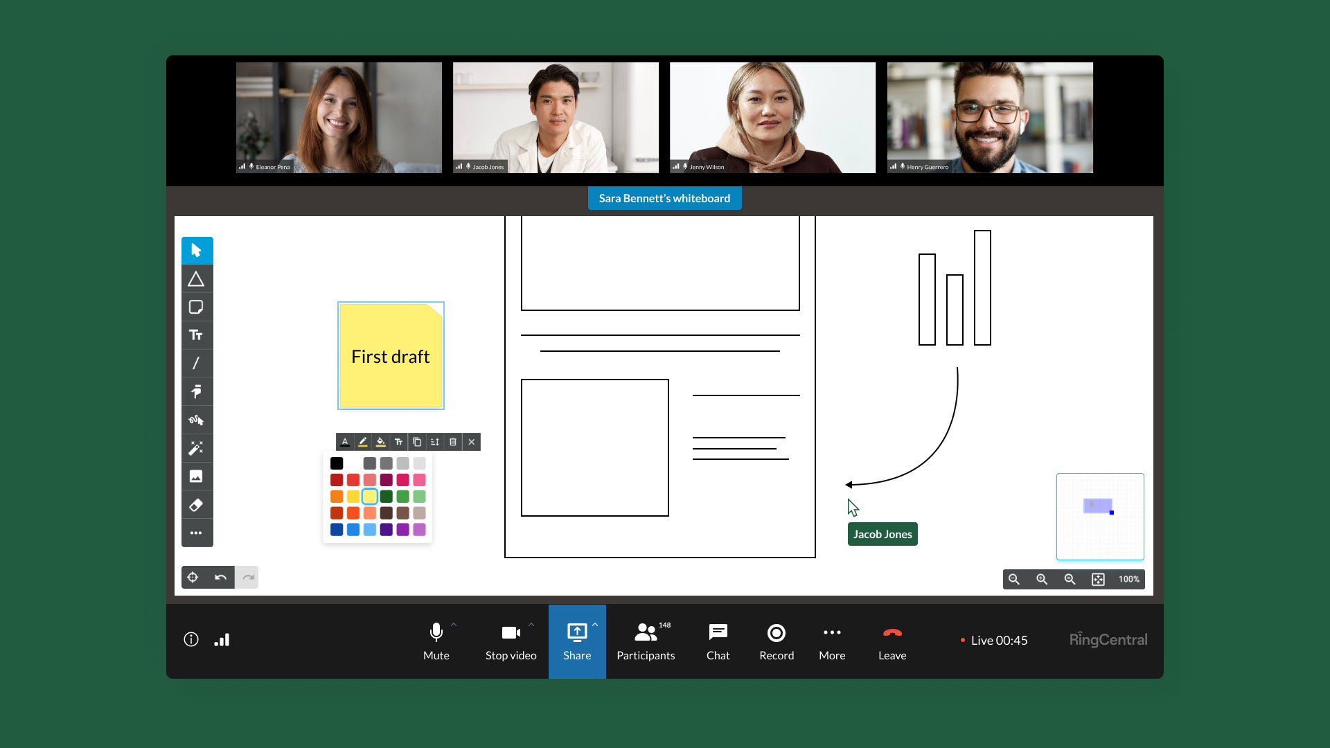- Whiteboard: Mit dieser Funktion steht Meeting-Teilnehmer:innen eine digitale Oberfläche für visuelle Kollaboration zur Verfügung, einschließlich einer Mini-Legende für vereinfachte Navigation entlang der gesamten Whiteboard-Fläche.