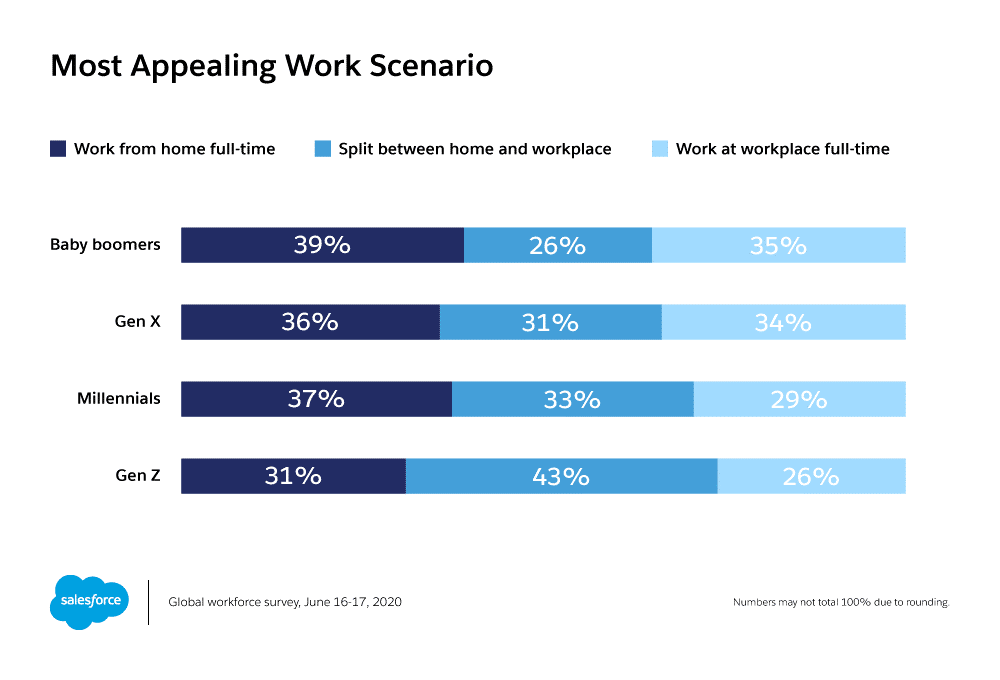 According to Salesforce data, Gen Z prefers hybrid working, while millennials prefer working from home, closely followed by hybrid working.