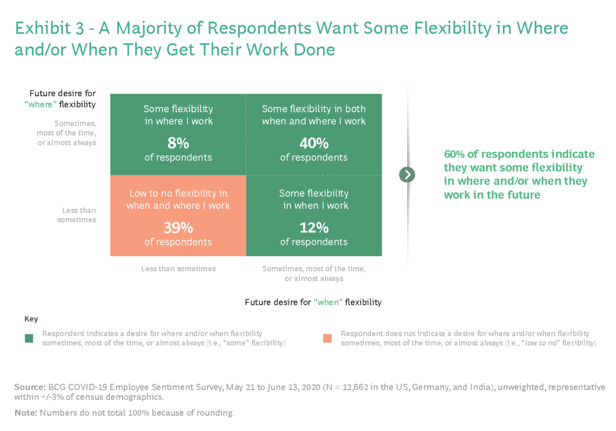 The hybrid work model of the future needs to balance remote and in-office work. Hybrid offices, therefore, need to have a mix of assigned, open, and reservable space. Space needs to be collaborative to support ad-hoc meetings and gatherings and allow employees to perform solitary tasks when necessary. This will require updates to existing physical office spaces – or require companies to consider adopting flexible office spaces.