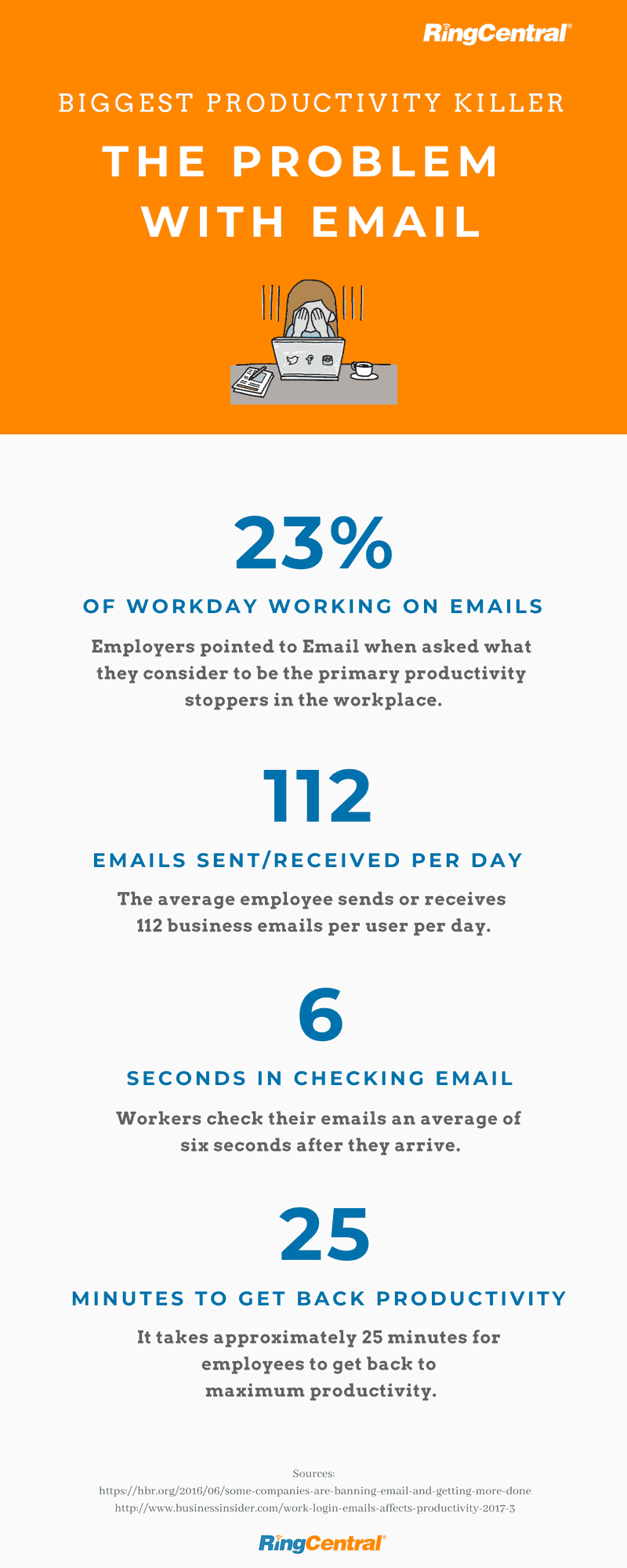 Email is the most entrenched of the old-school means of communication in this fast-moving digital age and perhaps the biggest productivity killer. Harvard Business Review reported that the average employee spends 23% of their workday working on emails, and the average employee sends or receives 112 emails per day. Business Insider revealed that workers check emails an average six seconds after they arrive, and then it takes approximately 25 minutes for those employees to get back to maximum productivity. Many companies have launched campaigns to reduce email use or curtail it all together.