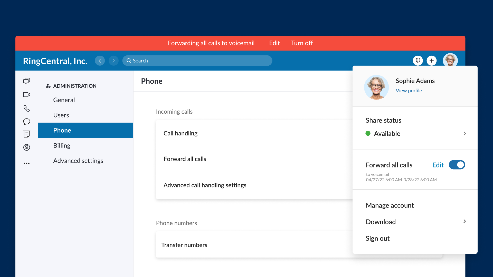 Similar to out-of-office auto-reply emails, your RingCentral phone can automatically forward your calls for you. This is available on both mobile and desktop.