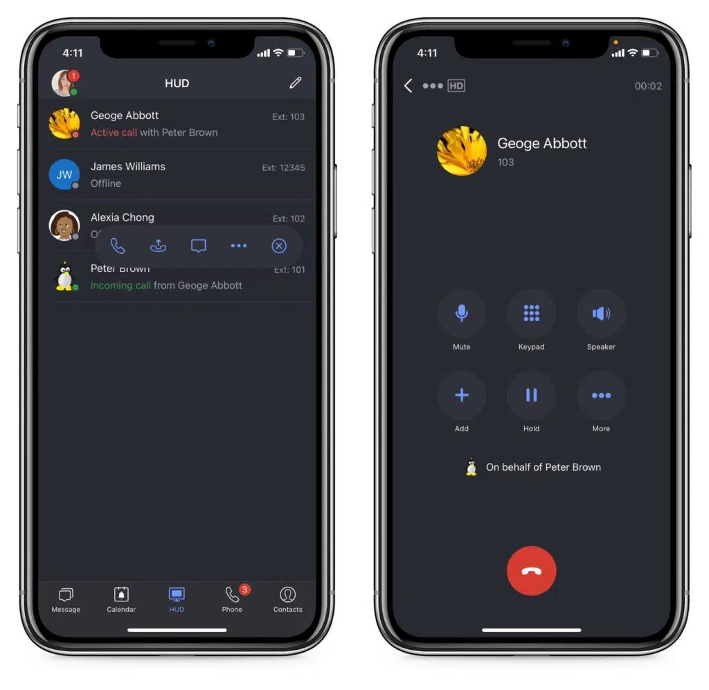 Our new HUD feature gives users, such as executive admins and receptionists, full visibility into their colleagues’ availability. When users receive a call on their RingCentral mobile app, they can see who’s currently online, transfer the call, add users to the call, chat with a colleague directly, or pick up a call on behalf of a colleague – from a desktop or mobile device.