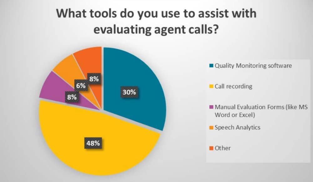 Business Systems UK found that 30% of centres used quality monitoring software. Such solutions help automate the processes related to tracking performance and CX. Those processes can include selecting calls to evaluate, gathering data, and calculating metrics.