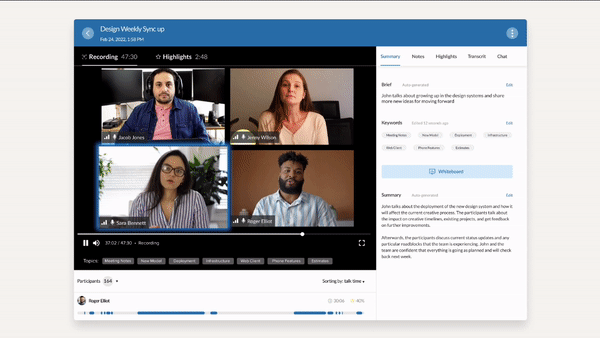 Recordings now come with data segmented by participant. In addition to insights breaking down speaking time by participant, the recording is spliced in a way that allows for users to playback a recording and focus on a particular participant.