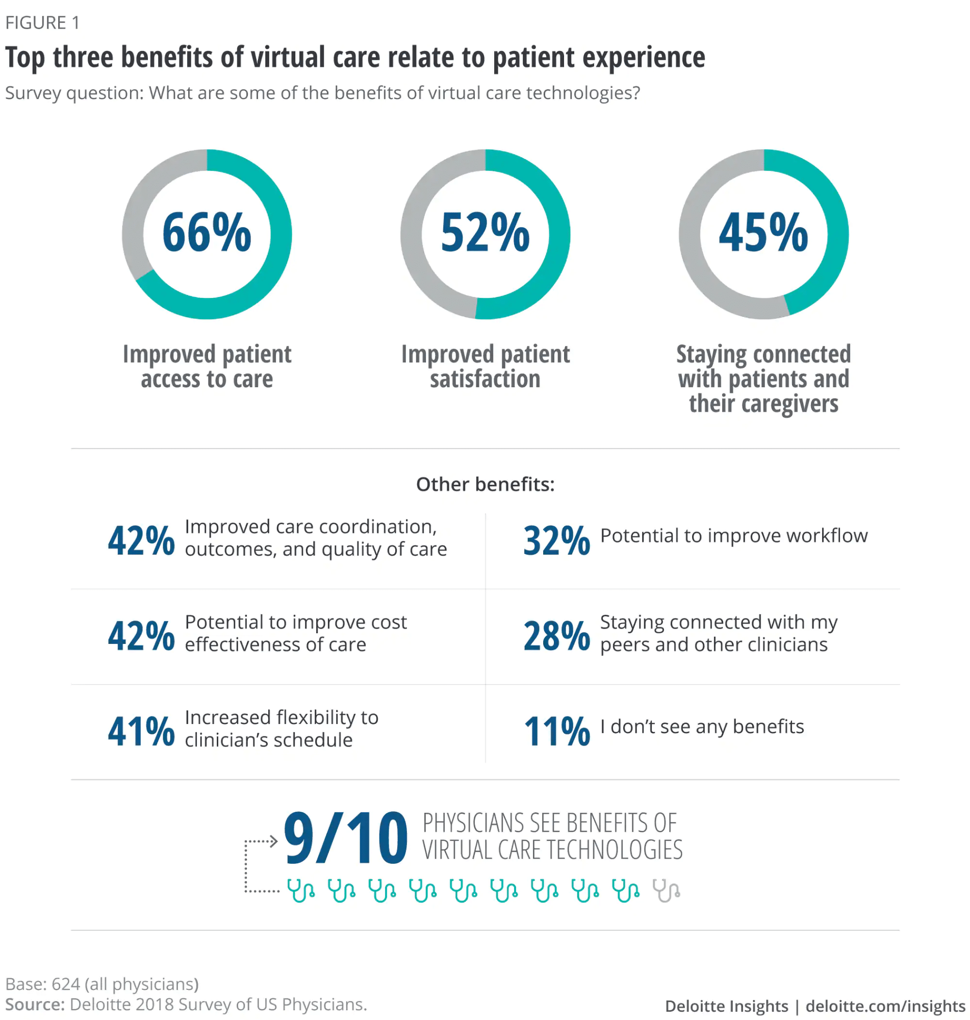 The technology issue is something that applies on both sides – for healthcare practitioners and patients. As you can see below in Deloitte’s survey of US physicians, 35% of respondents noted their workplace doesn’t offer appropriate technologies, while 23% noted their patients weren’t interested or didn’t have the technology to support it.