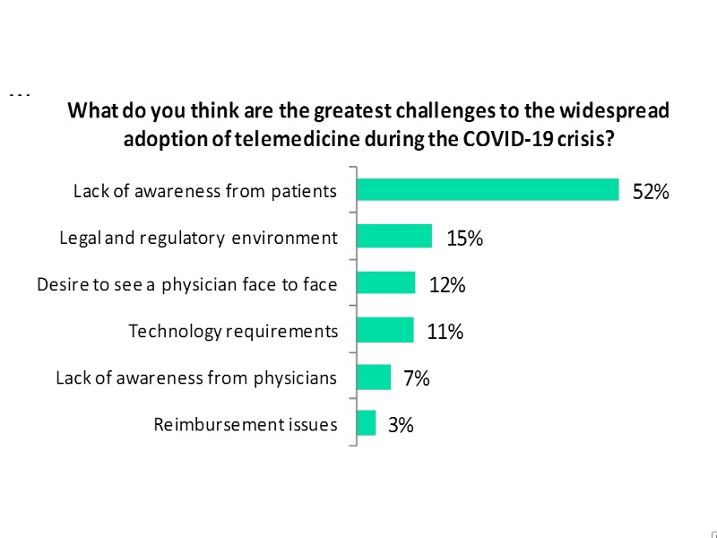 The next barrier to adoption, the legal and regulatory environment, is a major challenge. Healthcare providers must be very careful with confidential information, and any telehealth services used must have sufficient security in place. In the United States, the requirements are enshrined in law in the shape of the HIPAA. Covid-19 has somewhat shifted the playing field here, with certain restrictions being temporarily lifted but there are concerns as to how this will be handled when the pandemic subsides.
