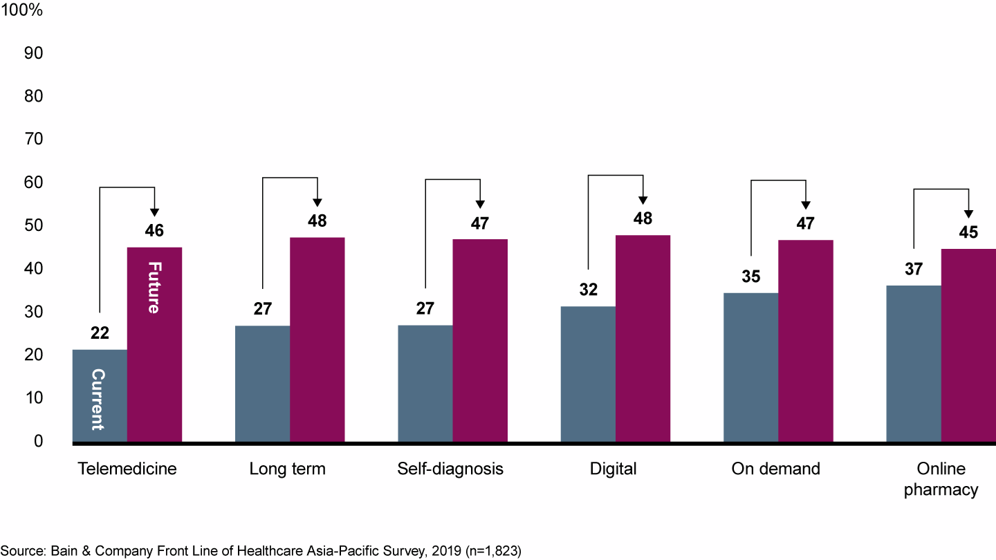 As mentioned above, there is some investment in telemedicine, but it’s limited in scope within the NHS. However, private companies are making great strides and adoption rates are increasing globally. Looking at Asia-Pacific countries, we can see that nearly 50% of respondents would use telehealth services in the next five years. This figure jumps to 91% of those services are covered by an employer or insurance.