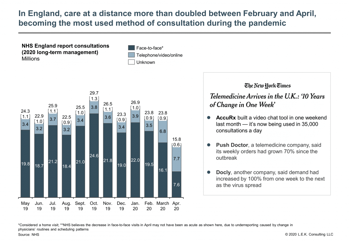 And again, similar results follow on in the UK. The former chair of the U.K.’s Royal College of General Practitioners, Dr. Clare Gerada, currently works across two practices in London. She is also co-founder of eConsult, which is an online health system that was set up by the Hurley Group (her NHS partnership). She told CNBC that she now only sees her patients face-to-face “very occasionally”, and that “about 99% or more of our care of patients has moved digitally or remotely onto the telephone…it has transformed.”
