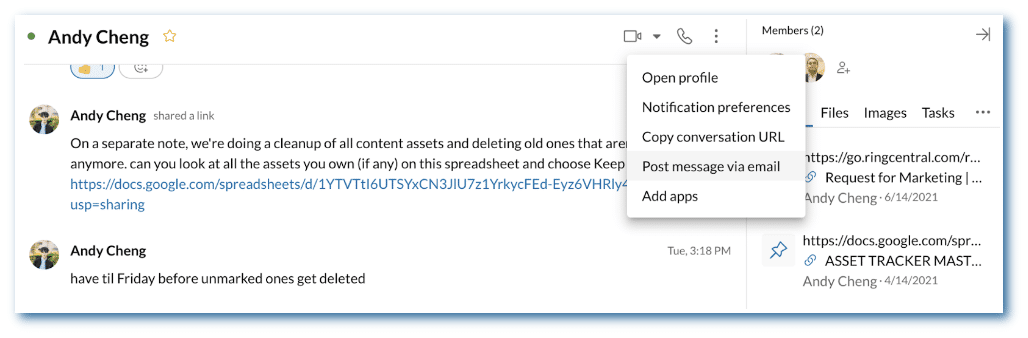 With RingCentral, you can post email messages to direct messaging or team messaging conversations automatically—uniting these two channels.