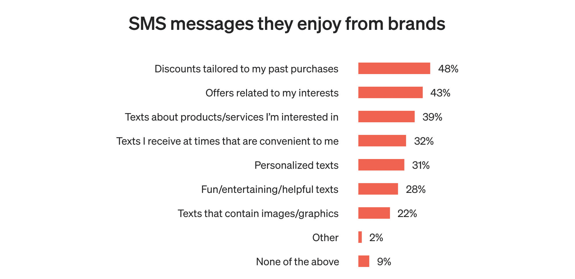 Klaviyo found most customers only want to hear from brands once a week or a few times a week. They don’t want to receive irrelevant, impersonal messages like articles or event announcements, either —- they want personalized texts containing tailored discounts, offers, and product/service info.