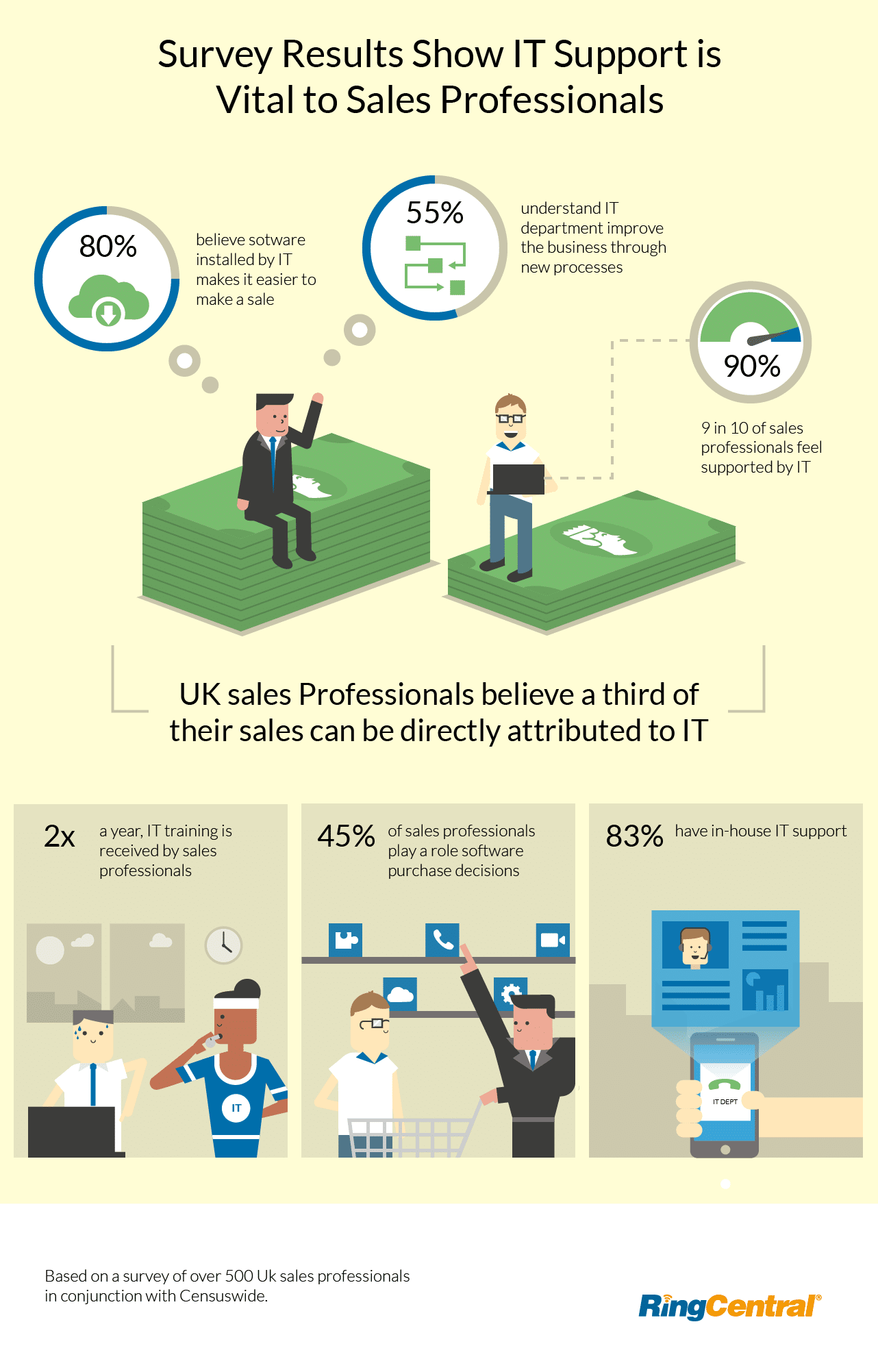 At RingCentral we think the IT department has a huge part to play in running a successful business. This month, we teamed up with Censuswide to ask sales teams across the UK if they feel the same way, and luckily they do! In fact, our survey revealed that UK sales professionals believe that just under a third of their sales can be directly attributed to IT.