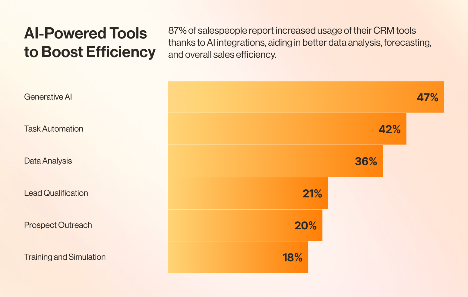 According to Hubspot’s latest AI Adoption study, 43% of companies use AI in their sales process—an almost 50% increase compared to last year. Usage is driven toward boosting efficiency using generative AI, task automation, and data analysis: