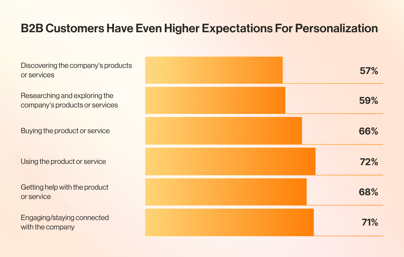 All of this content needs to be personalized to meet the unique needs of every customer. 57% of B2B buyers expect fully/mostly personalized content during discovery, and 59% expect the same during research: