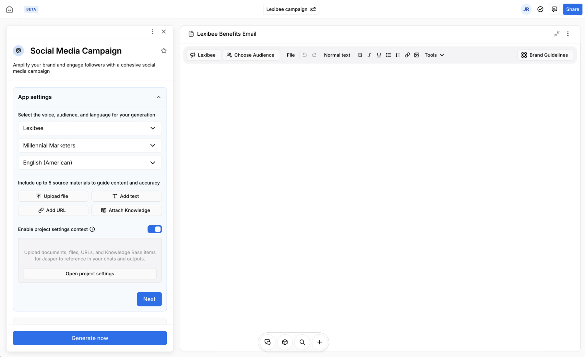 This is thanks to Jasper’s Brand IQ feature, which stores key company facts, product details, and messaging pillars for use across future prompts. The idea is that, once trained on a brand’s tone of voice, Jasper applies it to new content automatically.