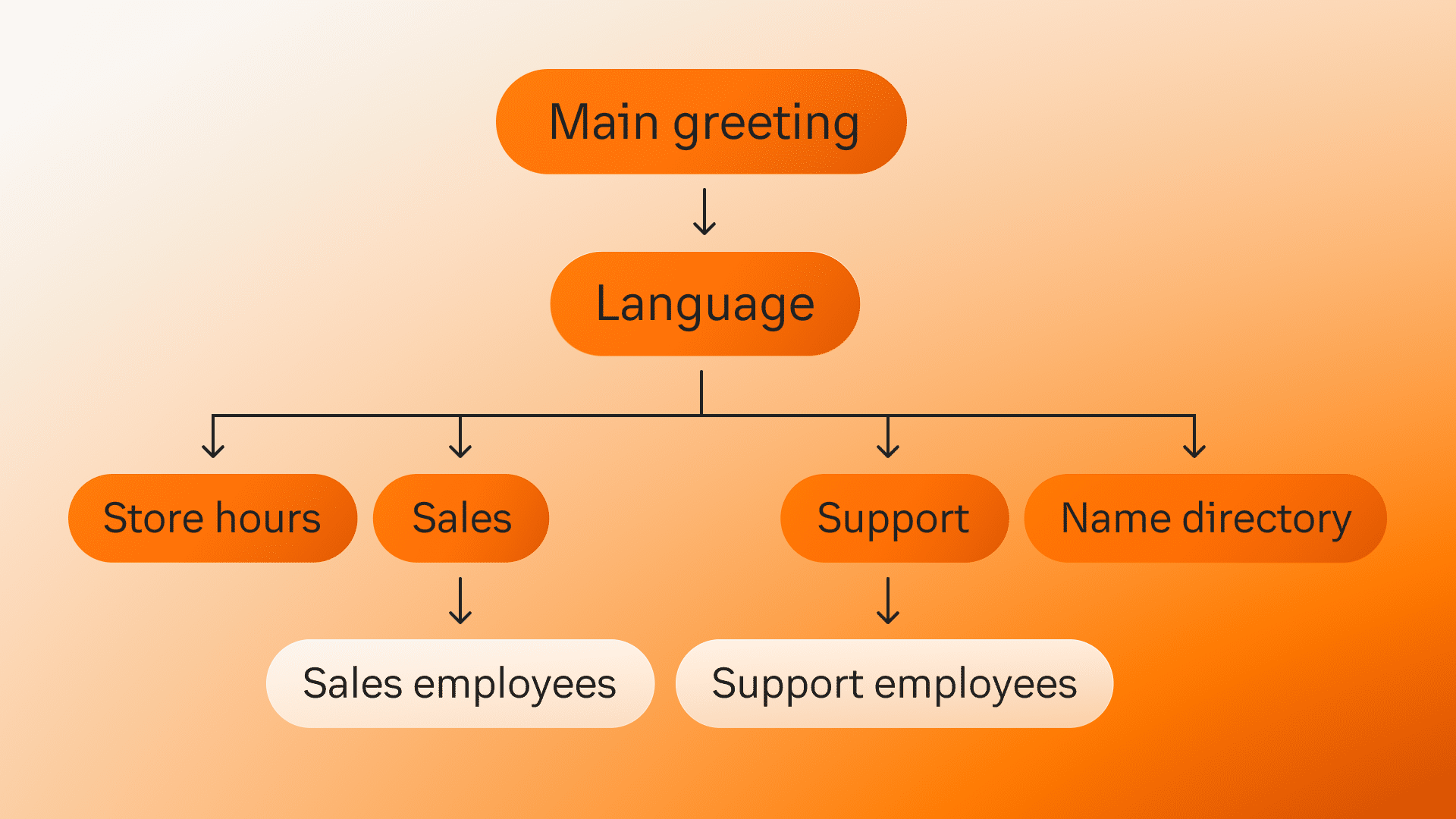 Self-service can be a great time-saver, as it enables customers to solve issues themselves and avoid long wait times. They can access FAQs, knowledge bases, or video tutorials, while software providers like RingCentral offer advanced speech analytics so that bots recognize and respond to common queries. This is known as interactive voice response, or IVR. Here’s a sample IVR flow: