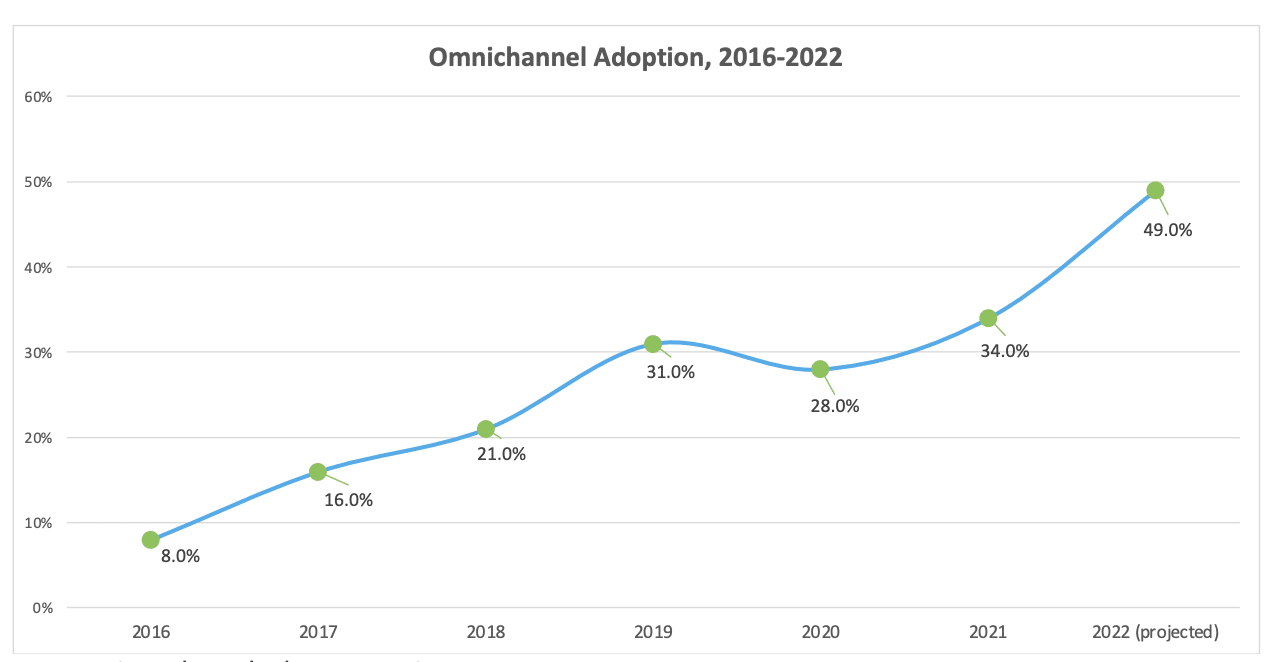 Here’s an interesting fact: Omnichannel adoption rose in 2021 to 34%, and in 2022 adoption is projected to be 49%. Leaders must prioritize omnichannel adoption. Interestingly enough, small businesses are 25% less likely to use omnichannel, so it’s even more crucial for them to prioritize adoption.