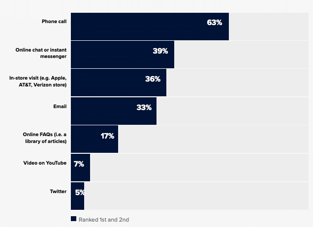 In our research, 63% of respondents ranked phone calls as either their first or second channel preference for customer support. It’s clear that digital channels are gaining in popularity as well, with 39% preferring online chat or instant messaging, 33% preferring email, 17% preferring online FAQs, and 12% preferring videos on YouTube or Twitter.
