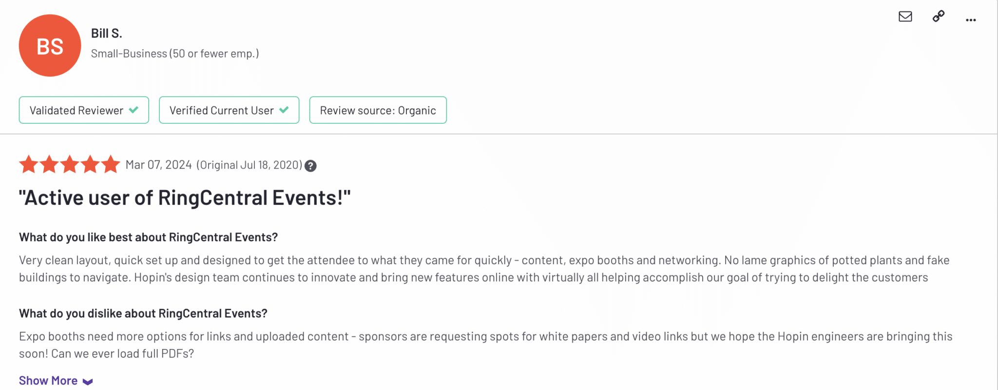 RingCentral Events is an all-in-one event platform that makes planning, producing, and attending virtual, hybrid, and onsite events easier than ever. From registration & branding to the event experience to the recording & analytics, RingCentral events has all the capabilities you need to take your event experiences to the next level. But don’t take our word for it. See what our customers are saying.