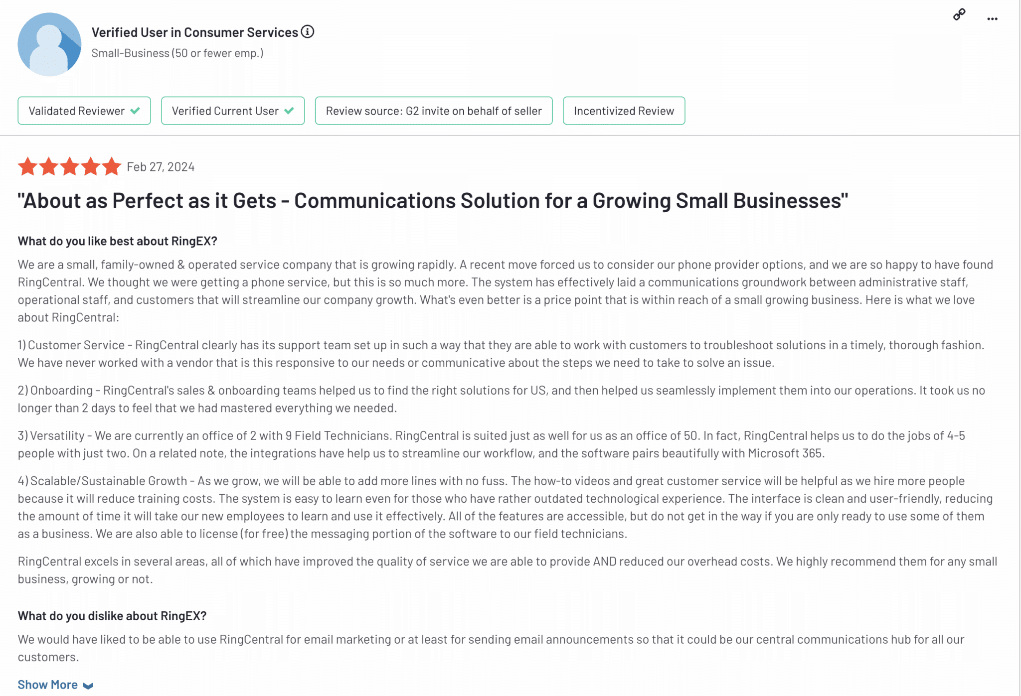 RingEX is the AI-first unified communications solution, helping businesses of all sizes across every industry communicate smarter. With one app for calls, video meetings, messaging, SMS and fax, RingEX meets every communication use case in your organization. But don’t take our word for it. See what our customers are saying.