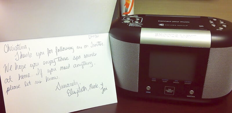 “Christina, Thank you for following us on Twitter. We hope you enjoy these spa sounds at home. If you need anything, please let us know. Sincerely, Elizabeth, Nick & Tori.”