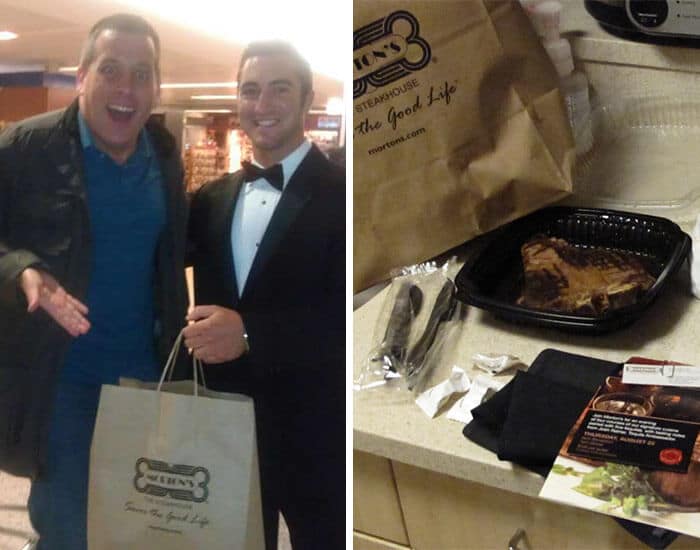 A few hours later, he was stunned to see a man in a tuxedo walk up to him in the terminal holding a Morton’s bag. Inside the bag was a 24 oz. Porterhouse steak, one order of Colossal Shrimp, a side of potatoes, Morton’s signature bread, two napkins, and silverware.