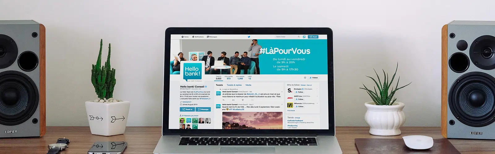 Ahmed: Hello bank!’s customer services are split into two teams. The first is responsible for supporting the customer or prospect over the course of their experience on the following channels: Facebook, Twitter, our forum: HelloYou!, and, recently, on external forums. The second team, which is integrated into the marketing department, is in charge of promoting the brand on a wider range of social networks (including YouTube, Instagram, etc.).