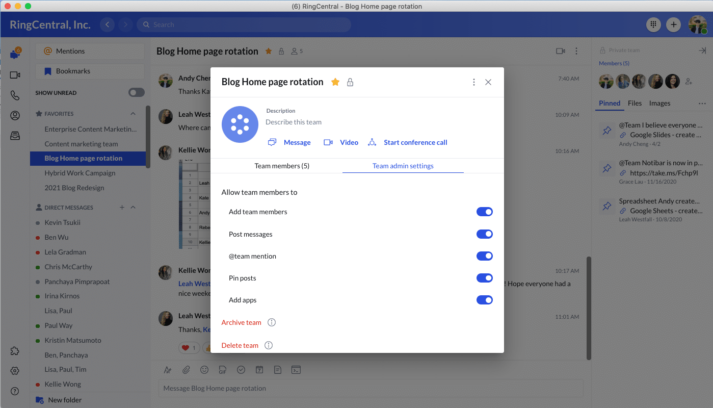 Permissions in RingCentral messaging teams give our product marketers control over the conversation so they can reduce any excess noise.