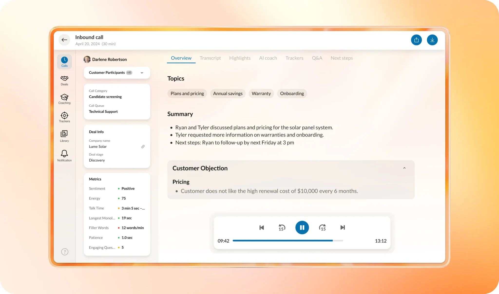 - CRM synchronization: Automatically keep CRMs up to date with conversation data and deal intelligence