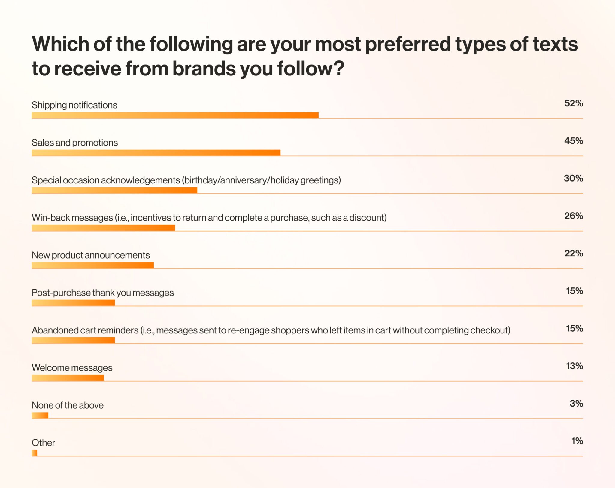 A recent survey by Validity found that promotional messages were customers’ second-favorite type of text message to receive from brands (45%).