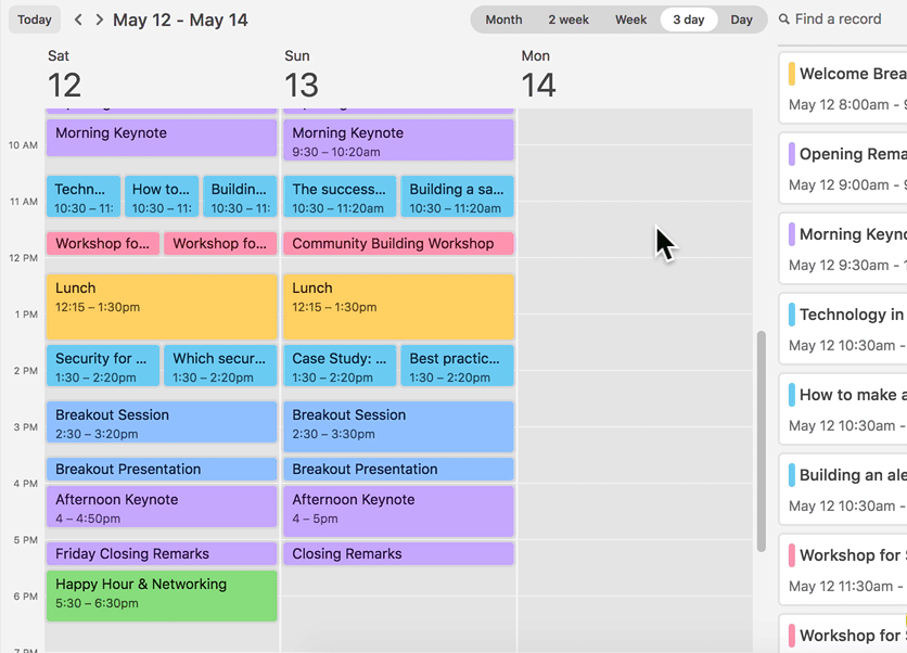 Below is a detailed company calendar from Airtable, serving as a sort of hybrid scheduler and project management tool. These types of tools can be used to manage your entire team’s calendar and individual schedules alike: