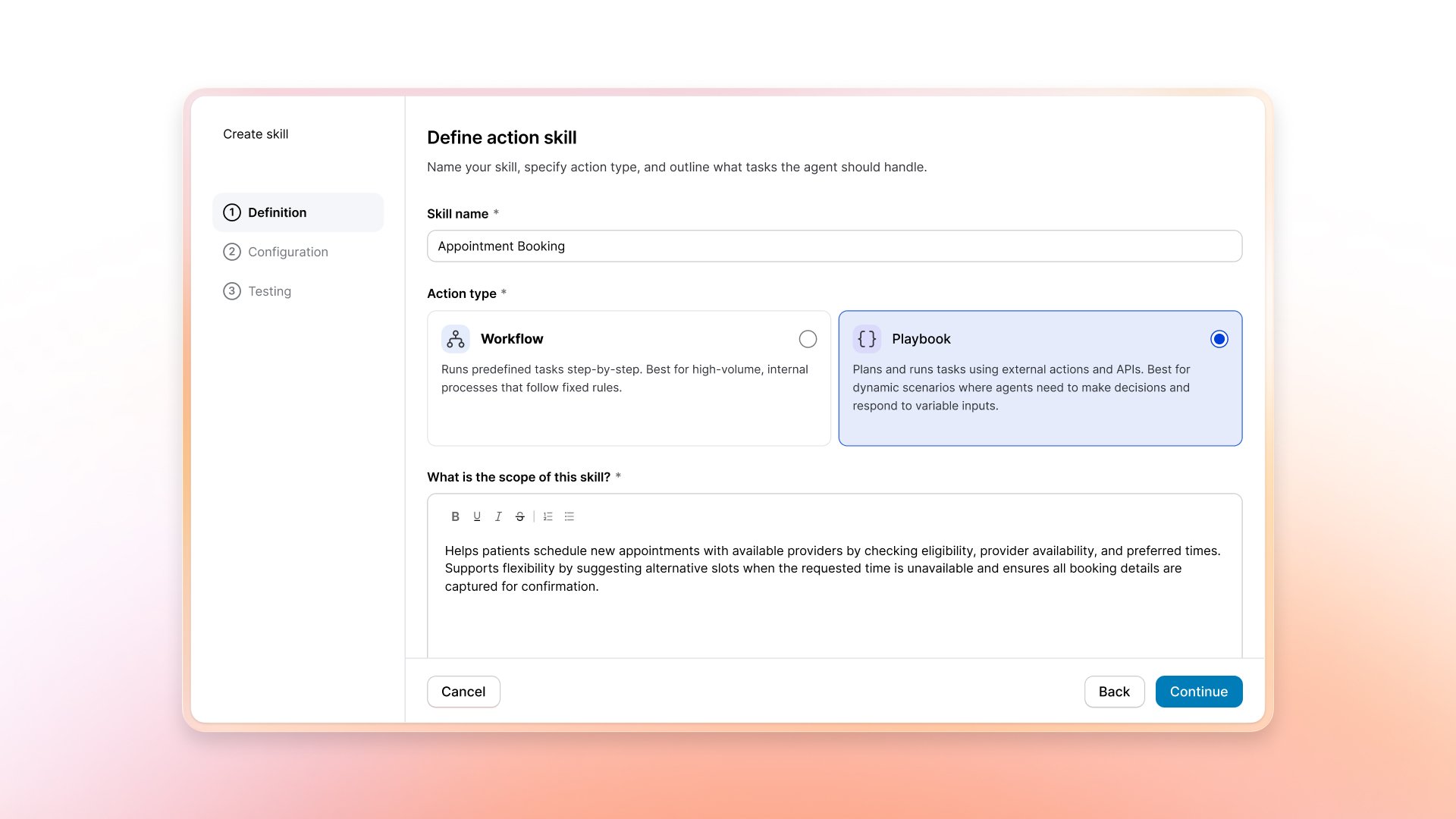 From a single workspace, teams can configure intelligent agents aligned to their brand, workflows, and systems. Then, deploy and improve them continuously.