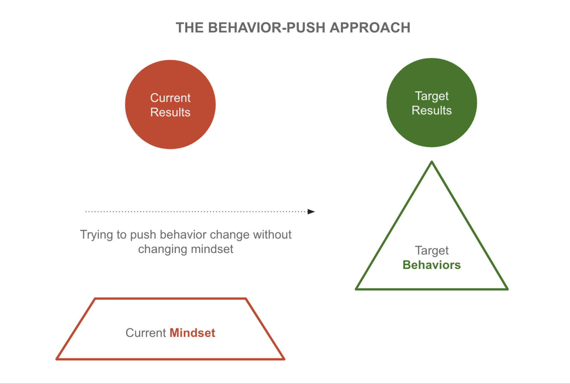 We are all leaders of many forms, whether we are leading other people as a team or leading ourselves to thrive excellence. When it comes to driving performance, we always think behaviors drive results. As long as one’s behavior can be managed or directed in a certain way, the intended result can be expected. No doubt, certain behaviors can lead to certain outcomes. Many leaders, through whatever means, can find ways to alter one’s behavior to achieve an envisioned result. However, this “behavior-push approach” of performance can only drive short-term outcomes without a fundamental transformation. The change from this approach is often resisted and falls back as soon as the pushing power is reduced.