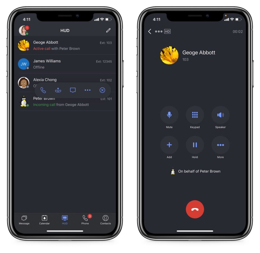 Our new HUD feature gives users, such as executive admins and receptionists, full visibility into their colleagues’ availability. When users receive a call on their RingCentral mobile app, they can see who’s currently online, transfer the call, add users to the call, chat with a colleague directly, or pick up a call on behalf of a colleague—from a desktop or mobile device.