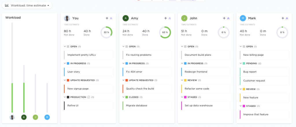 Not unlike Trello, ClickUp provides a basic project status overview and makes it easy for collaborators to move boards from Point A to Point B. The platform’s interface makes it clear who’s working on a task at any given time: