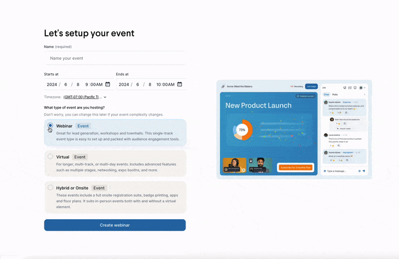 - Webinar event (formerly named Session*): a webinar-style event with our core event feature set. Select this when you just want a simple, single-stage setup (with studio production and engagement elements) for lead generation, product announcements, internal training, and more.