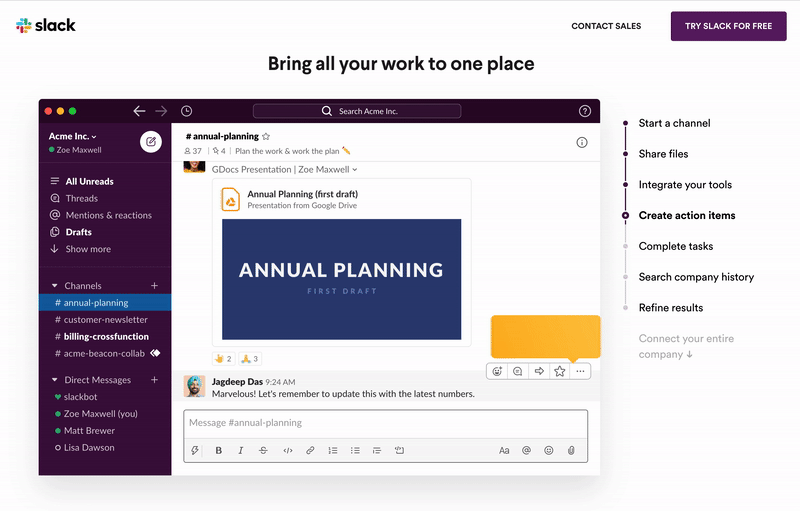 Slack is bound to top the list of most reliable product demo roundups right now, because they’re doing something really different. In the age of self-service, Slack has created a GIF-happy demo page where you can walk yourself through some of their most popular features. Simply scroll down the page and learn about different aspects of the platform.