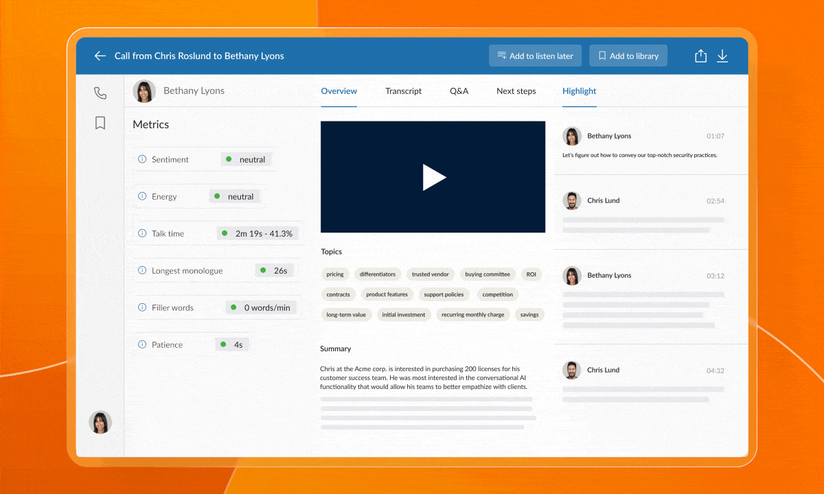 - AI Win/Loss Analysis: Automates win/loss reporting by extracting essential data from sales conversations. This feature is designed to provide strategic insights into sales performance–driving efficiency and enhancing sales outcomes.