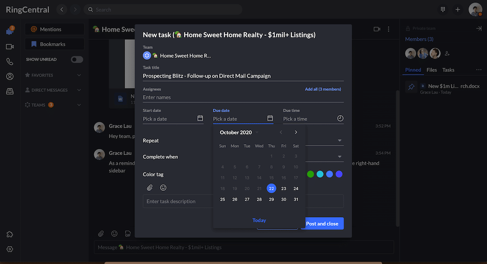 RingCentral’s cloud communications for real estate gives you that flexibility—and even lets you create tasks and events for yourself and your teammates. For example, to follow up on a direct mail campaign: