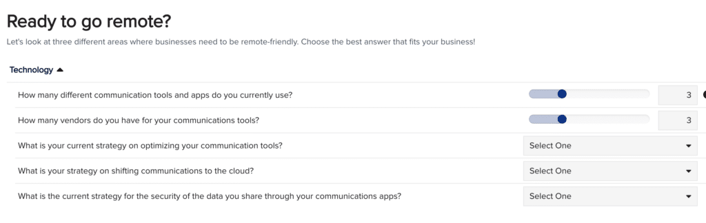 As leaders in the unified communications space, we’ve helped businesses of all sizes go remote. We have it down to a science, thanks to a few key ingredients. And unlike the older cooks in your family, we’re happy to share our recipe with you in this quick remote-readiness quiz. Take five minutes to tell us about your current business setups for technology, employee effectiveness, and client expectations, and we’ll help you find ways to improve remote readiness. It’s this simple: