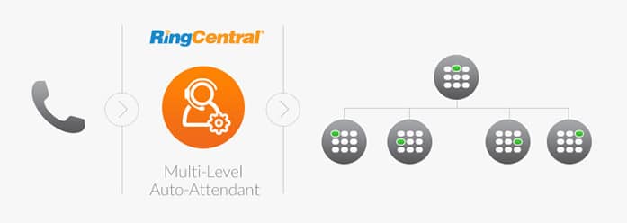 What is multi-level IVR (multi-level auto-attendant)? It is an alternative option to extend the current auto-receptionist options with more powerful and flexible automated voice system. Callers are provided with more options to self-select how they can reach a person or department. It is easy to customize efficient and professional inbound call routing and telephone prompts based on the business’ needs. It also simplifies phone routing management for multiple locations via RingCentral’s secure, quality, cloud-based services.