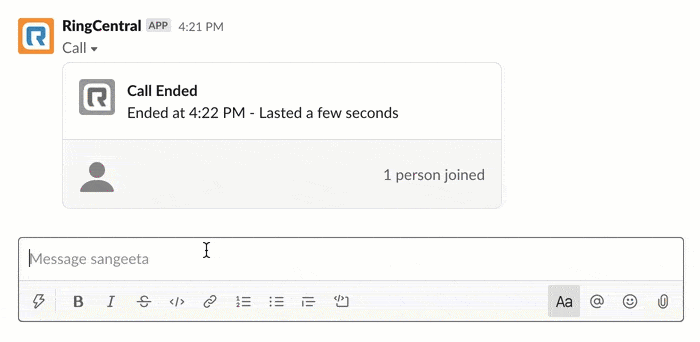 In our most recent integration release, we’ve added even more ways to access RingCentral within Slack, including making outbound calls to any Slack contact using RingCentral. Simply click on the native phone icon, and select RingCentral as your method of outbound dialing.