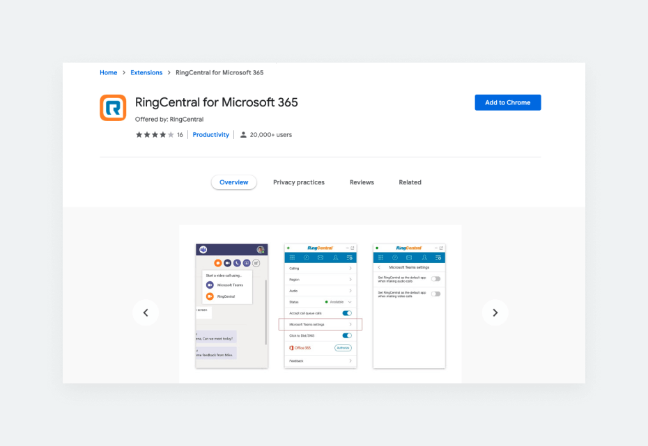 To get started, find RingCentral for Microsoft 365 in the RingCentral App Gallery. On the left side of the page under the logo, you’ll see a button that points you to the Chrome Web Store: