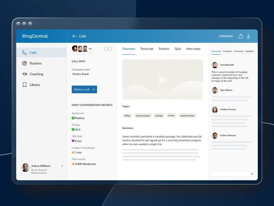 - Real-time, AI-generated transcription and post-call summaries from RingSenseTM AI to facilitate post-call customer management, documentation, compliance, and analysis